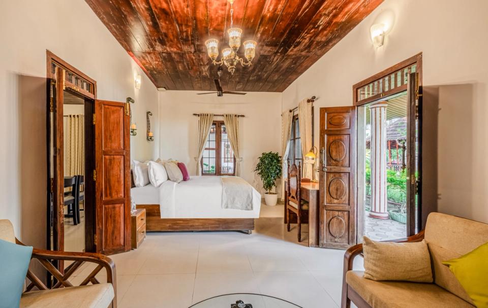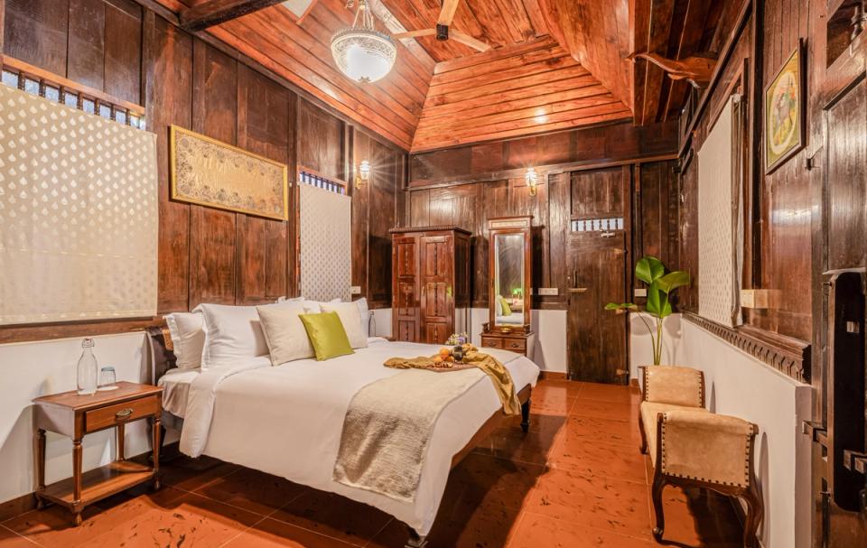 At the heart of the property is the 400-year-old Nalukettu—a traditional structure featuring a central nadumuttam (open courtyard), antique wooden pillars, and a river-facing veranda. The other rooms, including the 2 Royal Pamba View Rooms, the Garden View Suite, and the Mayuri Deluxe Room, look out onto the river or lush garden, each offering its own mix of charm and privacy.