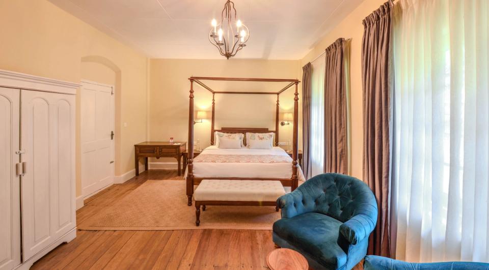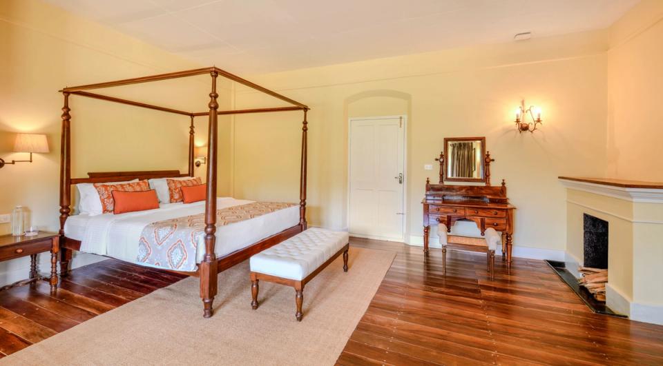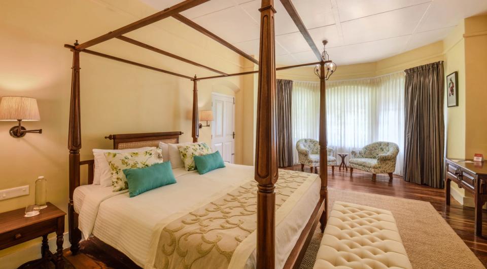 Indulge in the heritage of this bedroom, a spacious sanctuary boasting a beautifully detailed four-poster bed. Relax in the welcoming reading nook, complete with cozy chairs that enhance the villa's charm in Munnar.